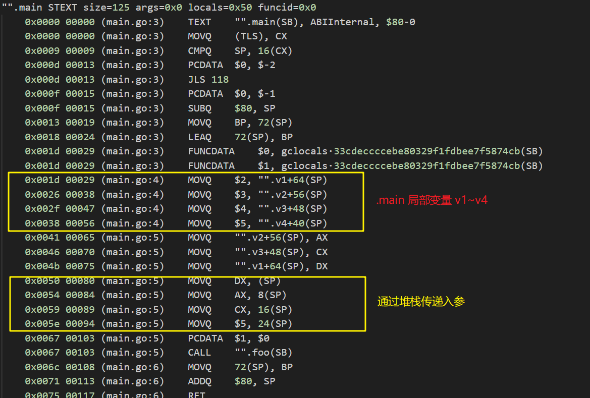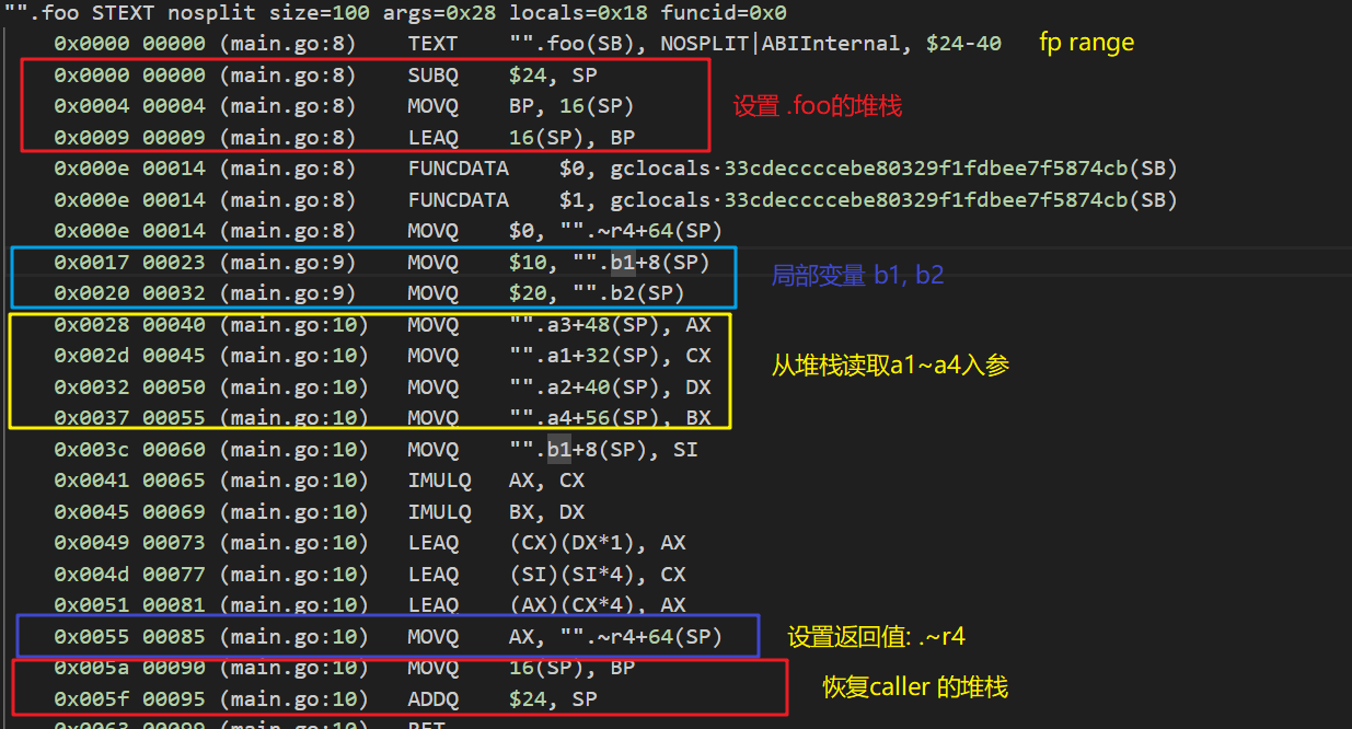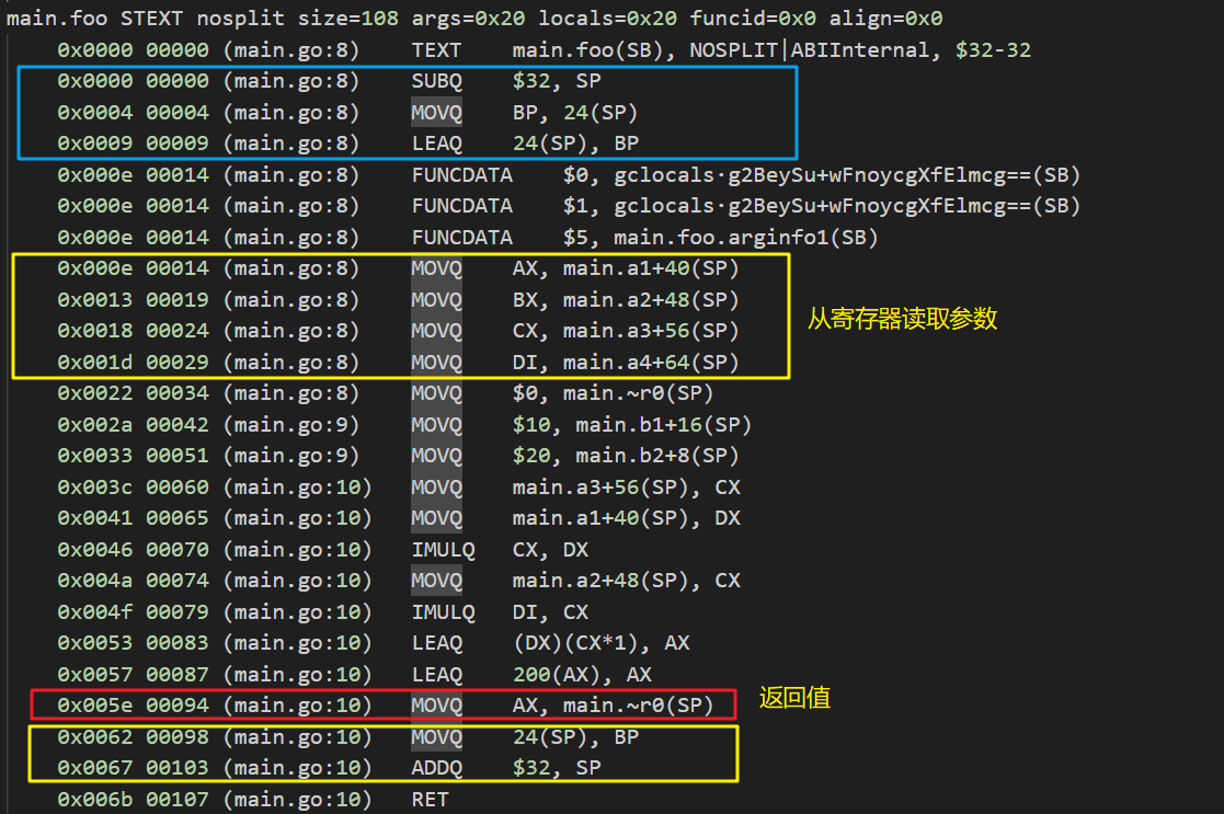 再看一下func foo(a1, a2, a3, a4 int64) int64函数的反汇编代码: