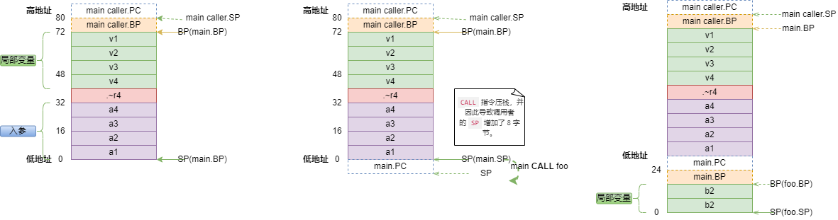 当CALL指令执行时,会压栈caller的PC,上图即main.PC导致SP+8;