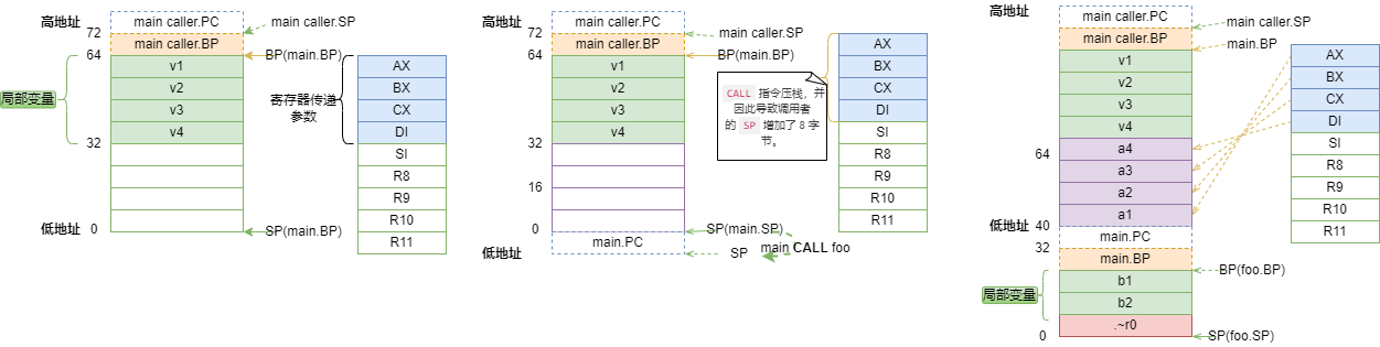 对于ABIInternal要稍微复杂一些,我们将9个寄存器看作一个char数组,通过参数的offset来访问。只需要记住当寄存器能满足参数或返回值的存储时,第i个参数或第i个返回值的,可通过regs+offset,比如第一参数为int时为regs+0对应AX寄存器。特别需要注意的是,当参数或返回值过多或寄存器大小无法满足时,ABIInternal会使用堆栈来传递参数或返回值。就可能会出现一个参数或返回值恰好同时跨越寄存器和堆栈,但这种情况时不会存在的。比如[]byte的结构是{data,len,cap},不会出现data和len通过寄存器传递而cap通过堆栈传递,如果出现同时跨越的情况,那么将该参数将会全部通过堆栈传递,即{data,len,cap}都通过堆栈传递。