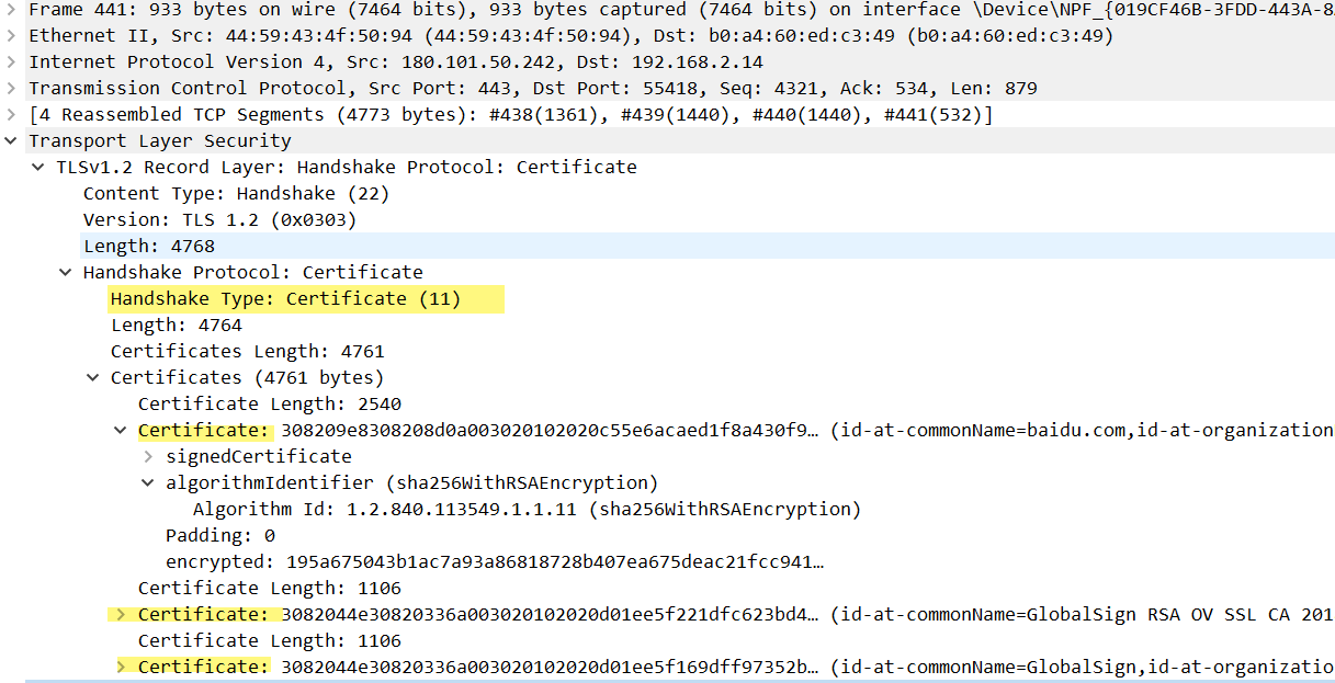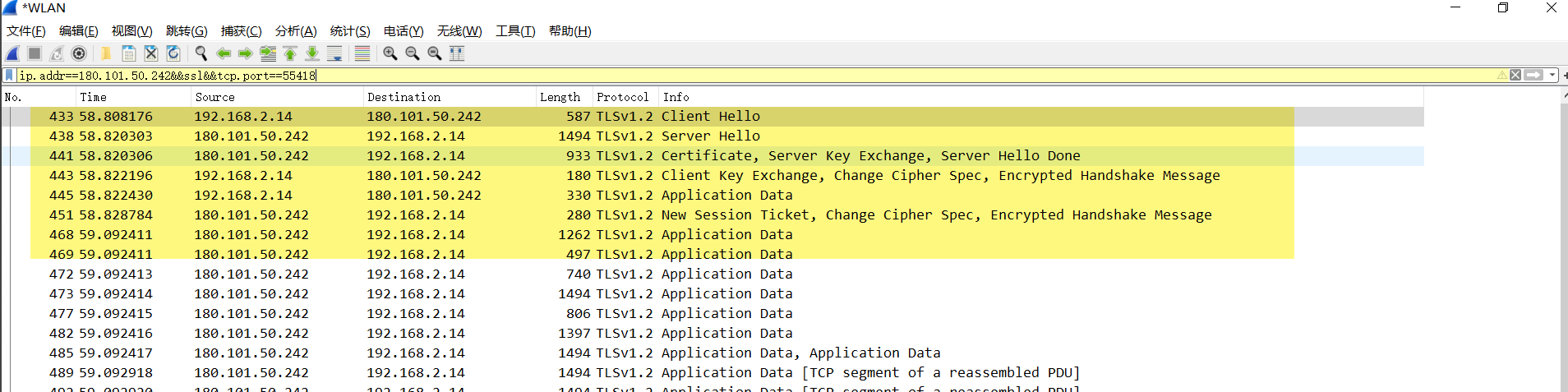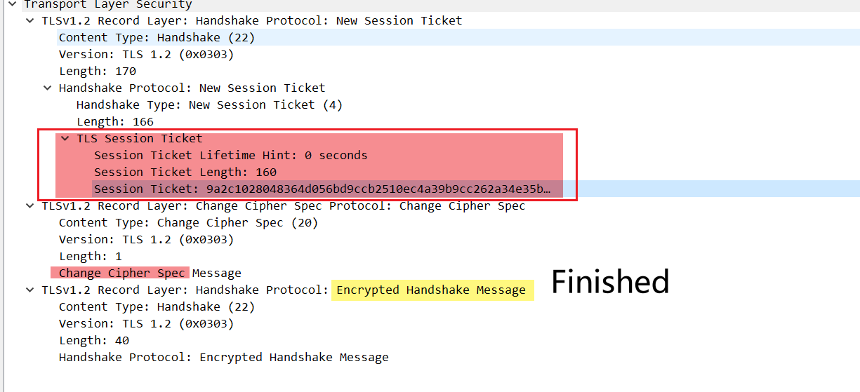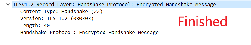 注意,由于Finished子消息是第一条加密的消息,所以WireShark并不能识别出来。