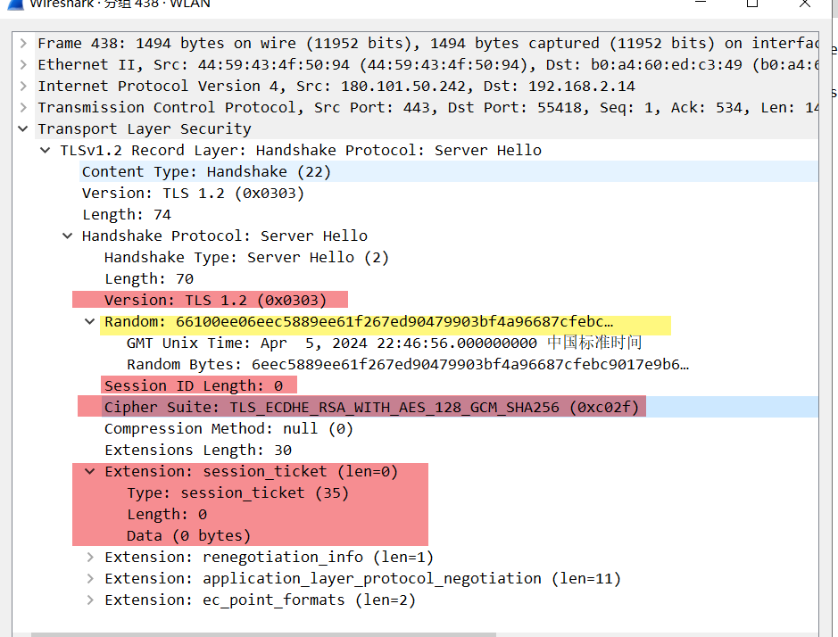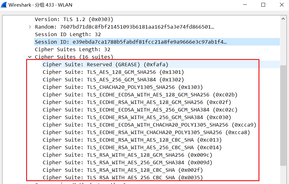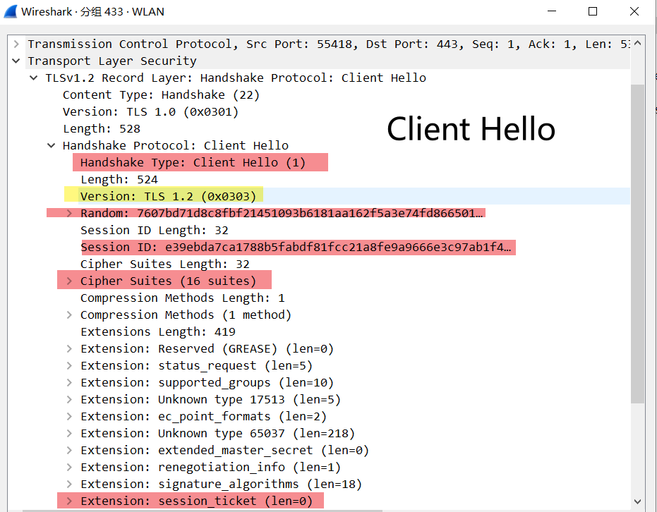 能得出,本地支持TLS v1.2 协议,并且看到了携带的随机数、支持的密码套件(16种密码套件)和SessionID以及一些扩展信息。