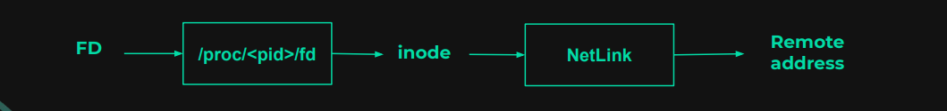 所以对于长连接来说我们是无法知道远端地址和端口的。一种解决方式是在用户态根据pid和fd找到inode然后根据netlink得到。