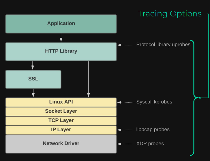 在选择观测HTTP的切入点是,我们有三种选择,kprobe,tracepoint,uprobe.我们选择了tracepoint的原因主要是其是内核已经提供好的切入点,相对其他两者比较稳定,且基于TCP 大多数切入点已经被静态化为tracepoints。